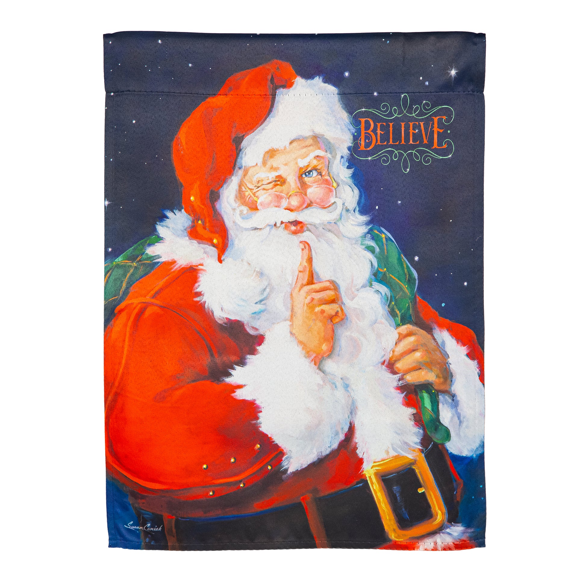 Decorate for the season and welcome friends and family to the home with this suede house flag. It features Santa himself with his sack of presents thrown over his shoulder and mischievous expression. The word “Believe” greets friends and family as they step through the door. Artwork is heat transferred onto the sun-blocking material so that it is easily viewed from both sides. The weatherproof poly-suede will not fray or fade with continued outdoor use. This flag features a sleeve for use with any standard flagpole or stand, sold separately.