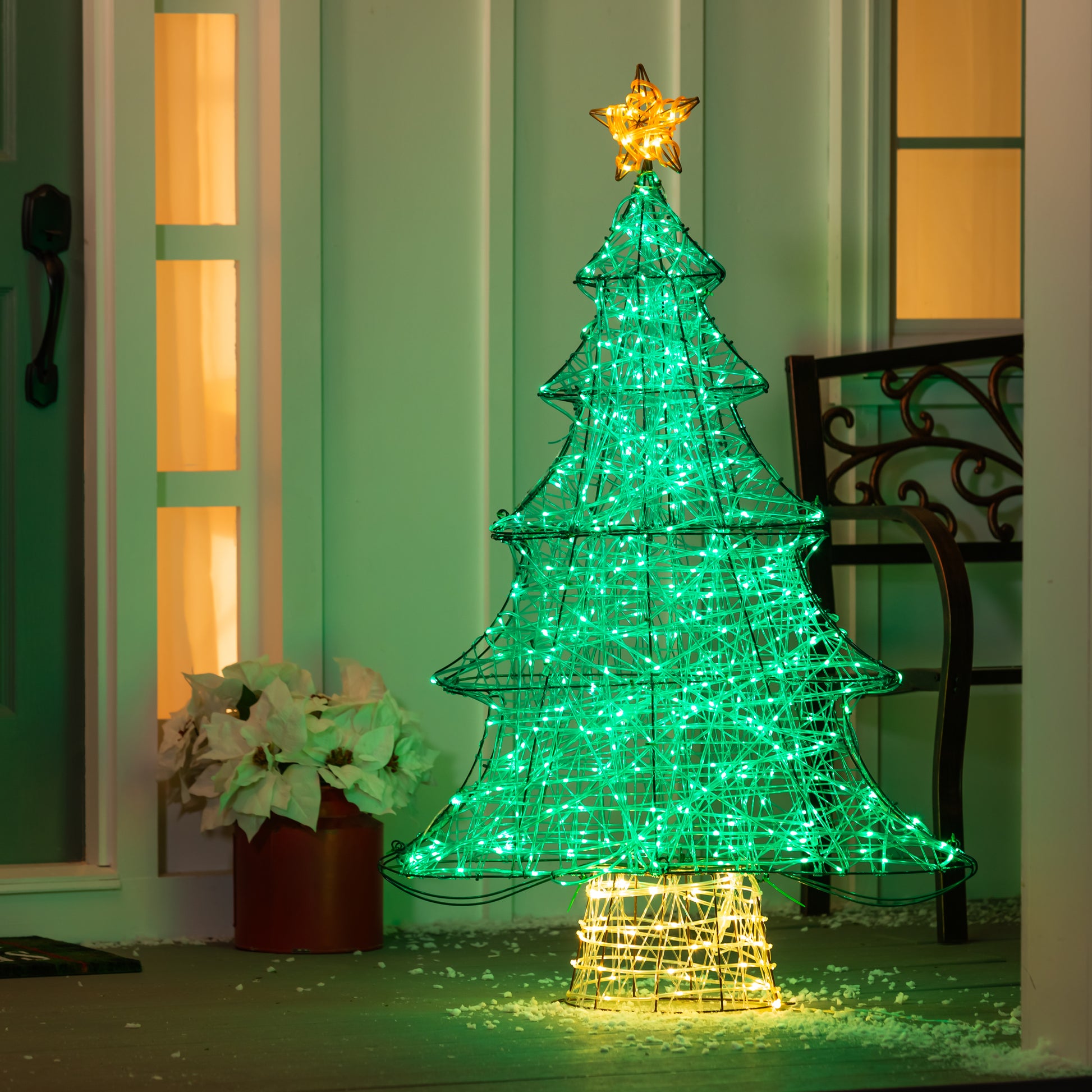 Bring festive fun to any home with this tree and create a cozy garden space. Christmas carolers and other guests will be delighted with this light up Christmas tree. It features a wire construction with a golden base and tree topper. The tree is made of bright green lights. This piece is outdoor safe and weather-resistant to last year after year.