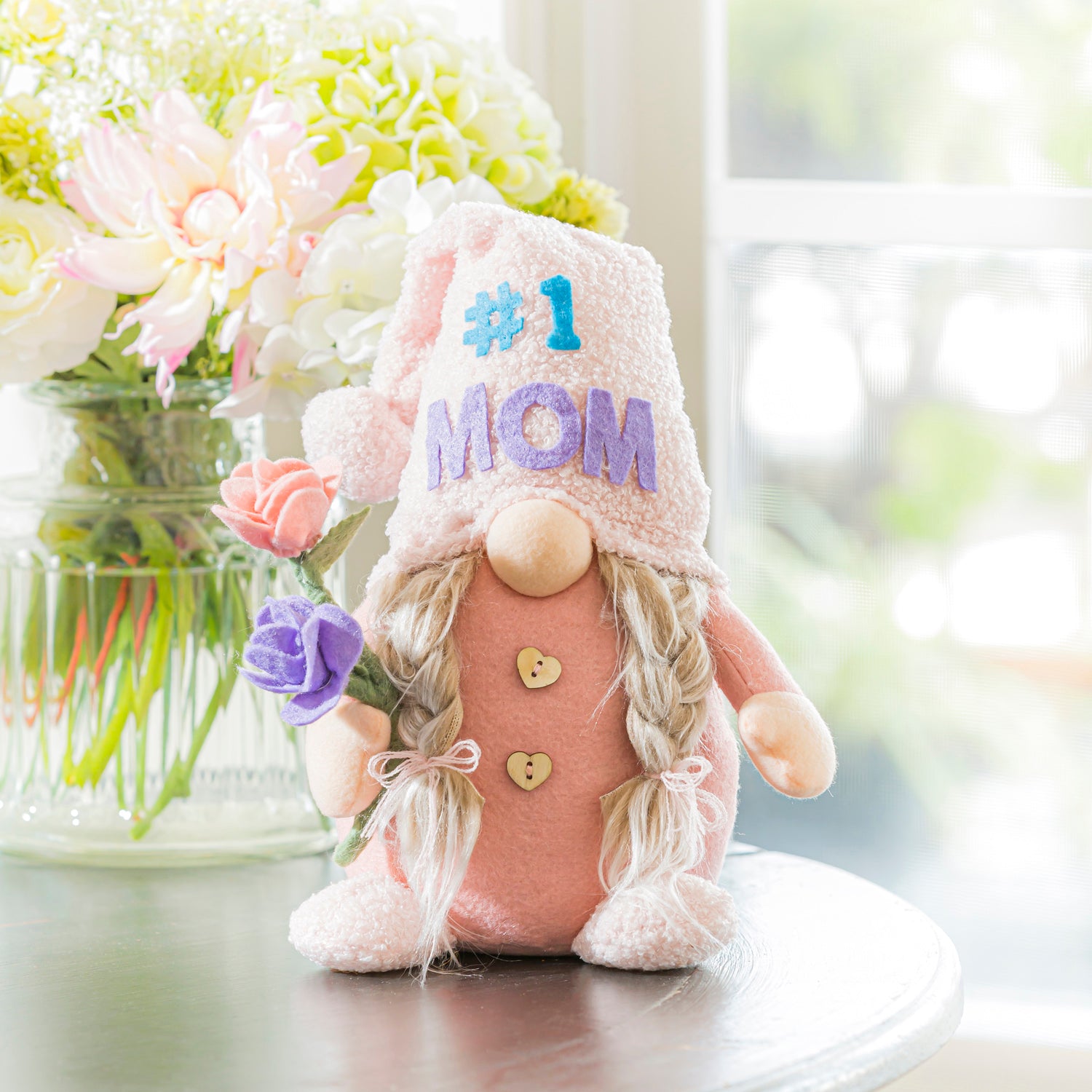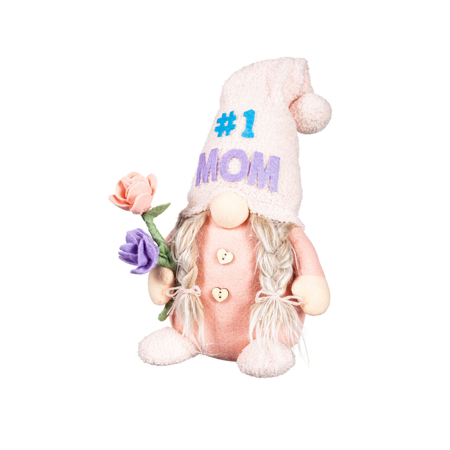 Show appreciation for a loving mom with this fabric gnome table decor. This lady gnome makes a charming addition to an office, tabletop, mantels, and more as she dons a hat that reads #1 Mom while holding a pair of vibrant flowers. Crafted from textile, wood, and stone, the gnome stands at 9.5 inches tall and makes a thoughtful gift for a mom on her birthday or Mother's Day.