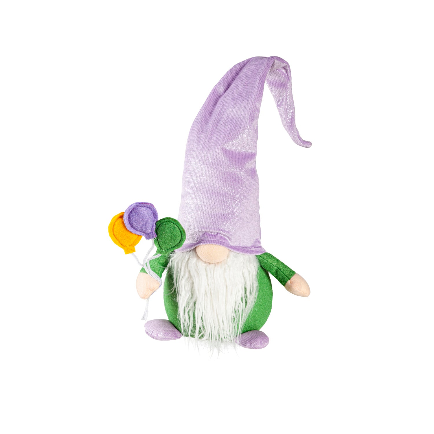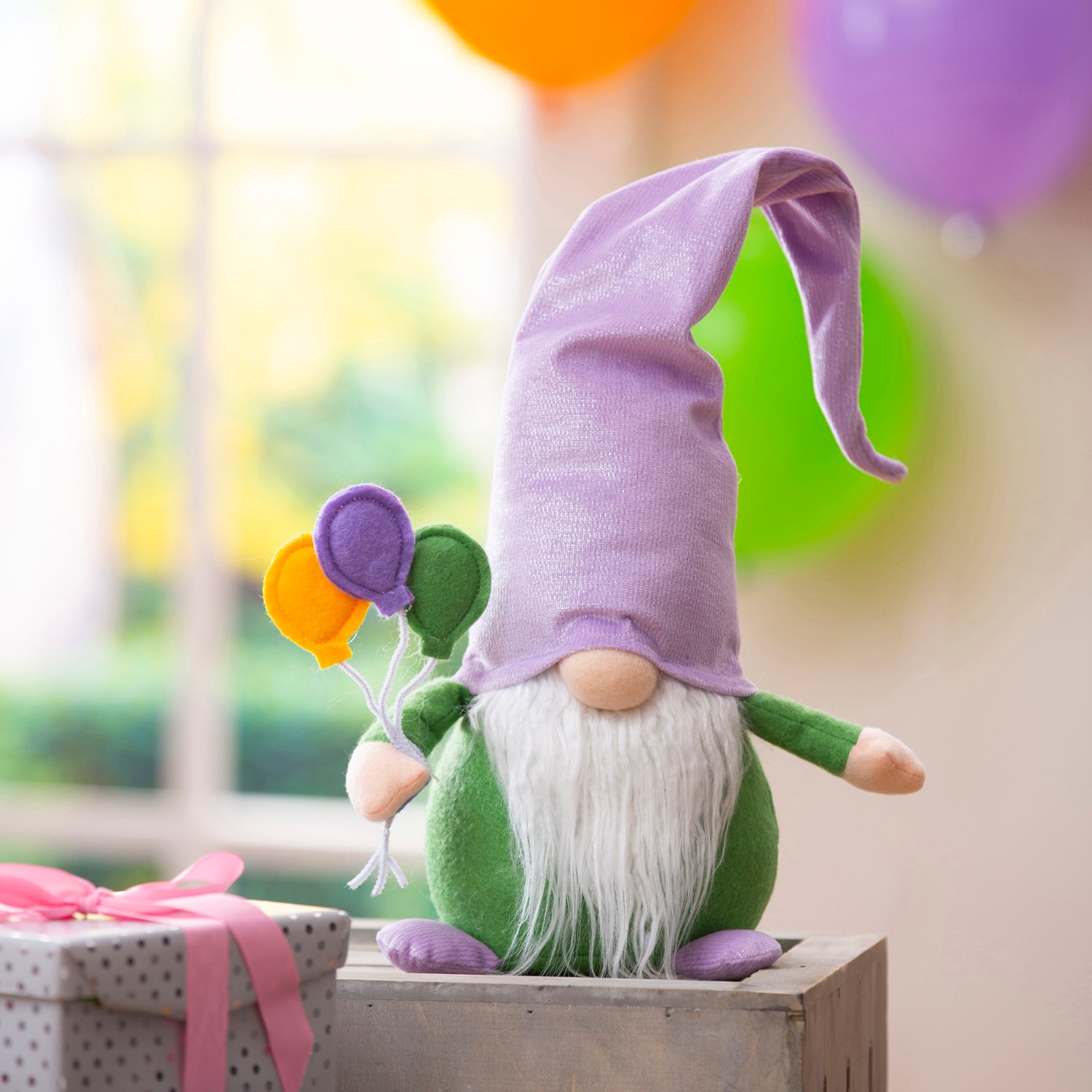 Whether you're celebrating a birthday or hosting a summer get-together, this gnome embraces the festive spirit. The gnome makes a charming statement as it wears a purple hat and green outfit with three colorful balloons in hand. Crafted from textile, stone, and metal, the gnome stands at 12 inches tall. The décor piece is sure to spread smiles and get guests into the celebratory mood when displayed on a countertop, coffee table, mantel, and more. Measures 8.5"W x 12"H x 5"D.