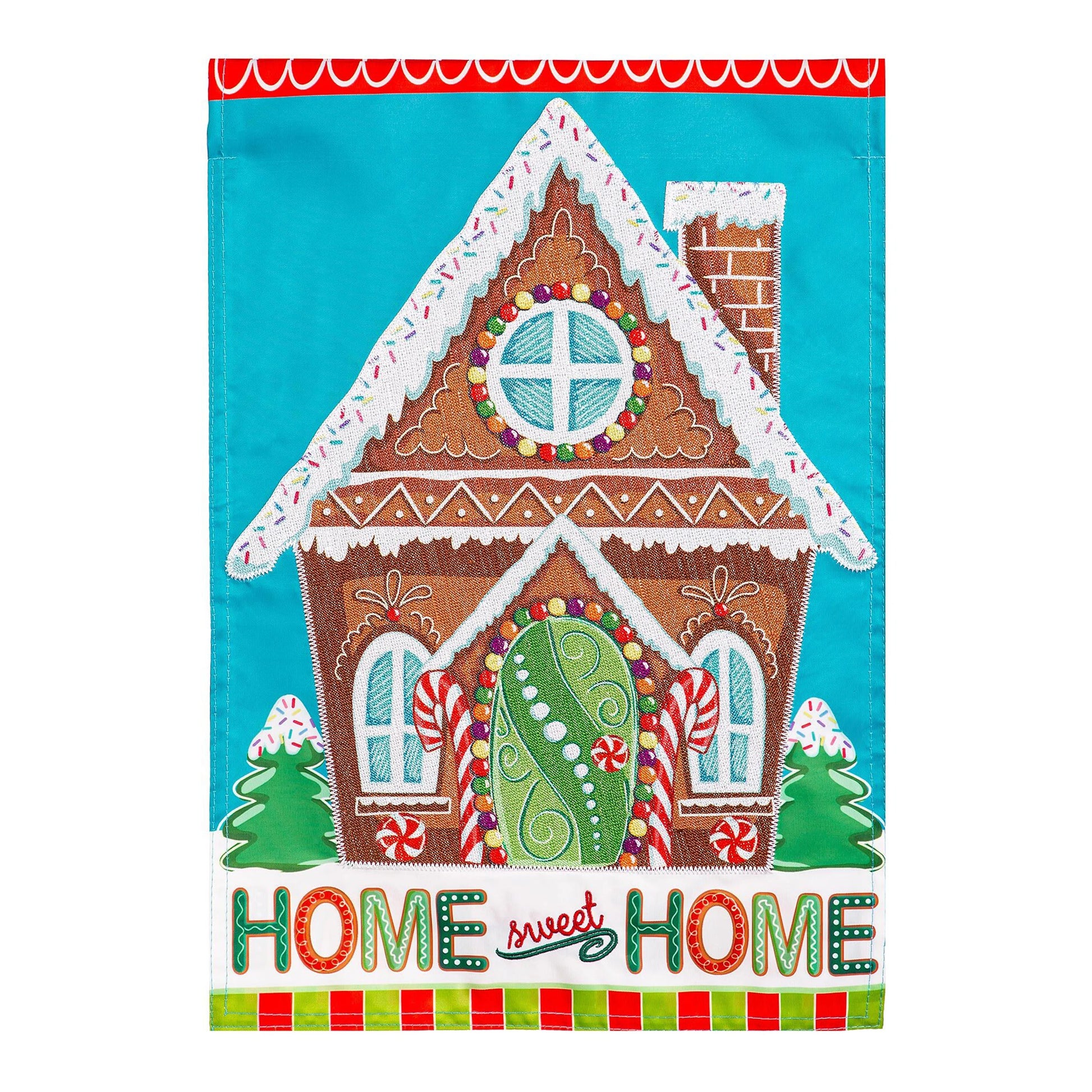 Decorate for the season and welcome friends and family to the home with this applique house flag. It features a charming gingerbread house decked out in frosting and candy. The “Home Sweet Home” message add festive flair to this flag. Each Evergreen Flag applique flag is carefully crafted from multiple layers of 310 denier nylon that can withstand a variety of weather conditions. We combine pieces of fade-resistant, strong fabric with tight, detailed stitching to create a dimensional mosaic effect. The soft yet heavyweight material illuminates beautifully in sunlight. Each flag features a sleeve that fits standard flagpoles or stands, sold separately. Due to the nature of the packaging, wrinkling may have occurred. Once item is unfolded and mounted on hardware, the creases will naturally fall out.