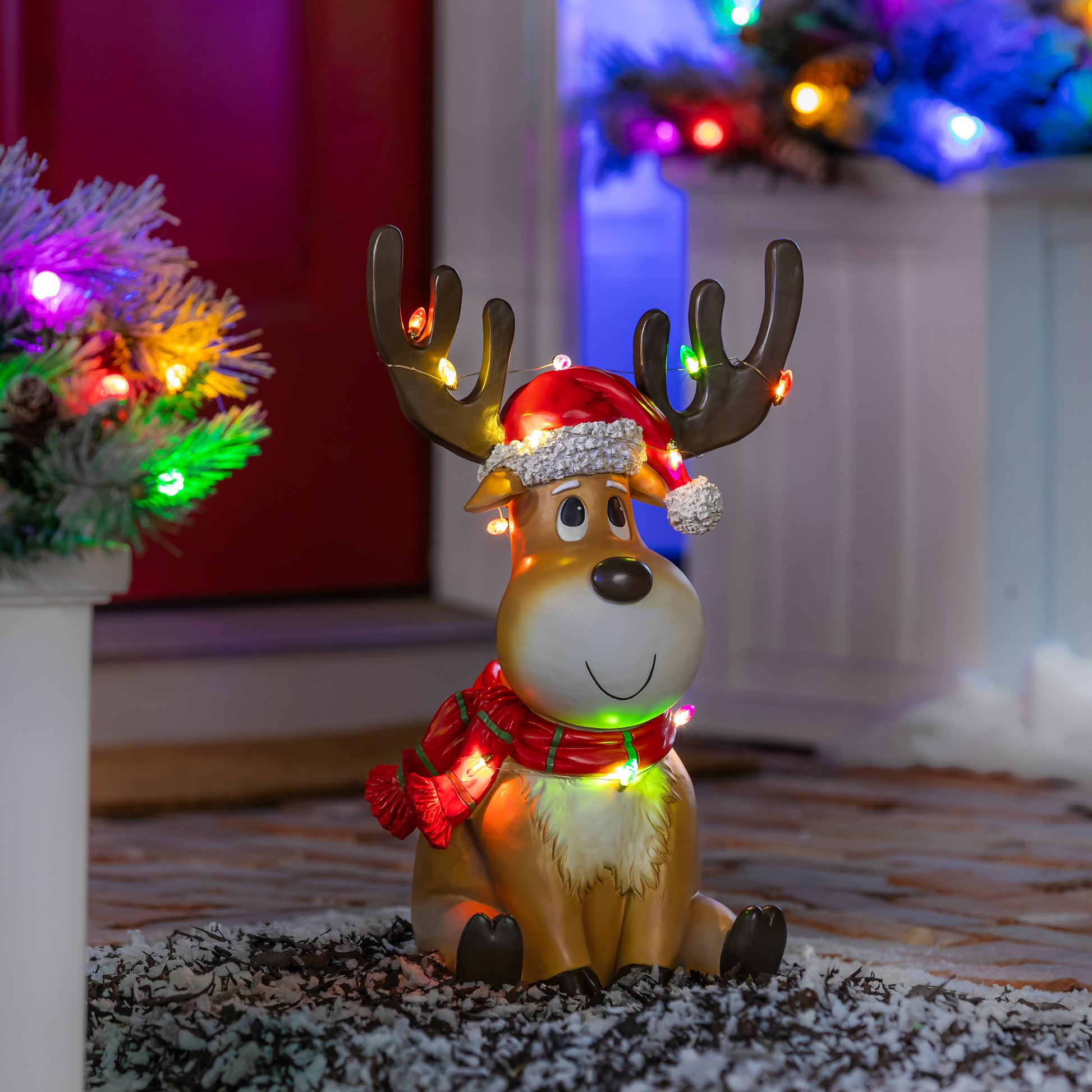 Add a cheery look to Christmas decorating with this LED Joyful Reindeer Statue. This sweet reindeer is tangled in lights and wears the sweetest expression. Statue has been made of durable, long-lasting polyresin. Set this statue outdoors in a covered area or display him inside in an entryway, living room, or anywhere that needs a little Christmas cheer. Requires 2x AA batteries, not included. Dimensions: 8.27"W x 10.43"L x 17.91"H