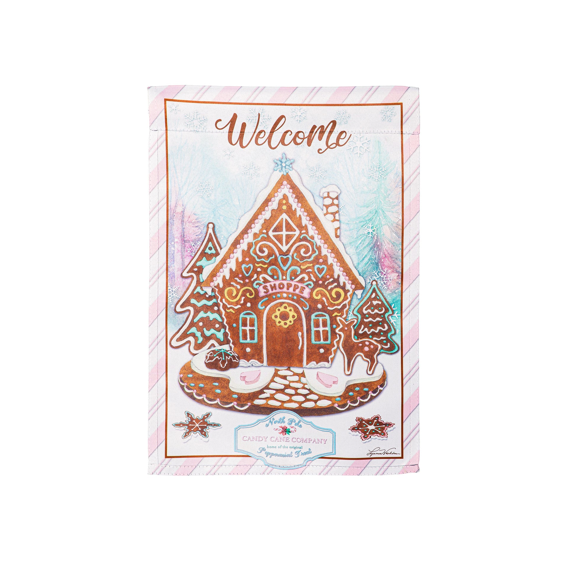 Decorate for the season and welcome friends and family to the home with this suede flag. This reversible flag has two designs. One features a gingerbread house and the other has a snowman family. The red and white striped border adds a charming touch to this piece. Artwork is heat transferred onto the sun-blocking material so that it is easily viewed from both sides. The weatherproof poly-suede will not fray or fade with continued outdoor use. This flag features a sleeve for use with any standard flagpole or stand, sold separately.