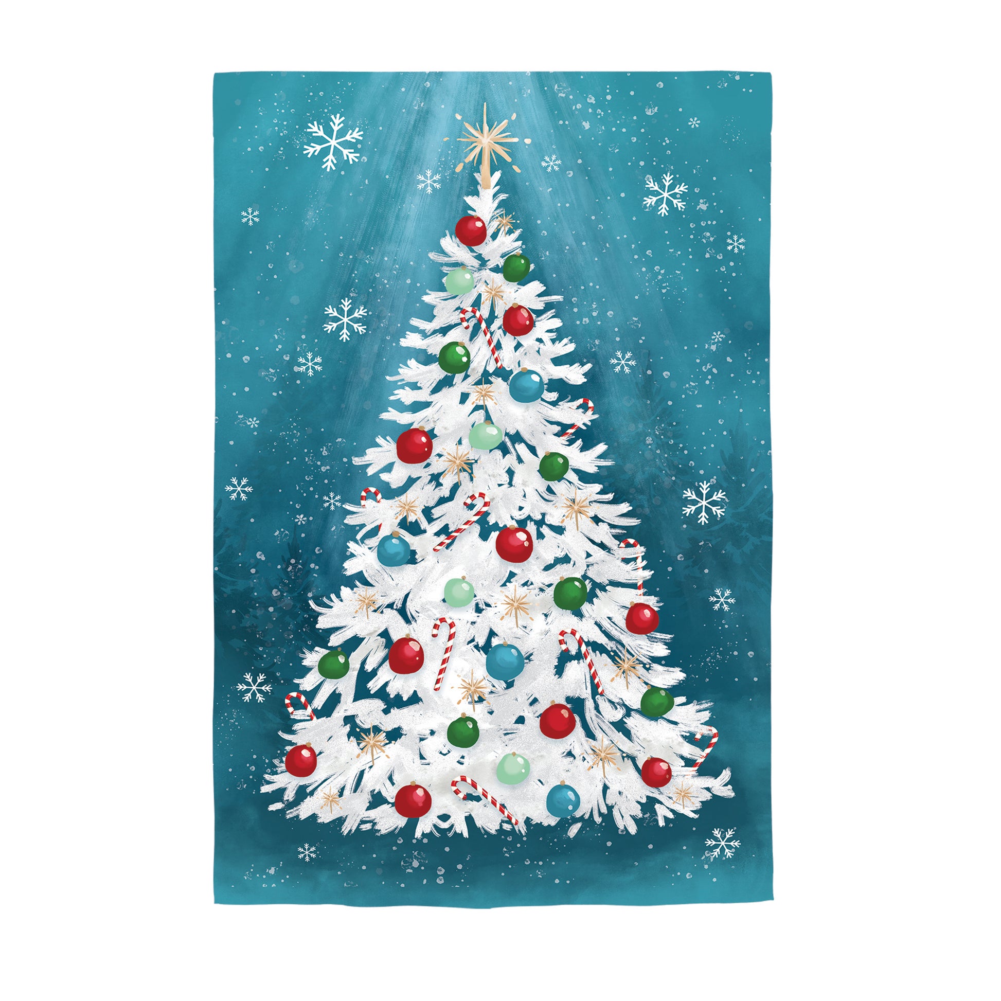 Spread holiday cheer all season long with this burlap flag. Boasting a beautiful white tree decorated with colorful ornaments and candy canes, this flag will make any outdoor space stand out this holiday season. Artwork is heat transferred onto both sides of the textured fabric to create a natural, crafted look. The poly-burlap is a durable and weatherproof material that will not fade or fray after continued display. This flag features a sleeve for use with any standard flagpole or stand, sold separately.